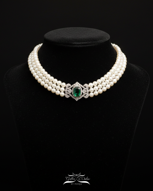 Three Layered Pearl Choker With Zirconia Beads